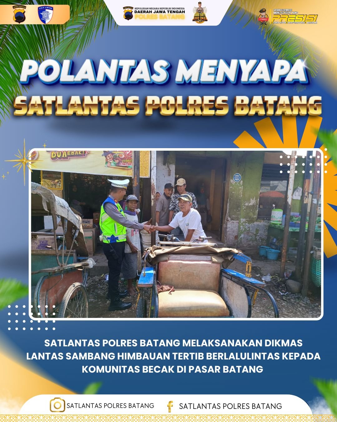 Satlantas Polres Batang melaksanakan kegiatan Pendidikan Masyarakat Lalu Lintas (Dikmas Lantas) dengan menyambangi komunitas becak di kawasan Pasar Batang, Kabupaten…